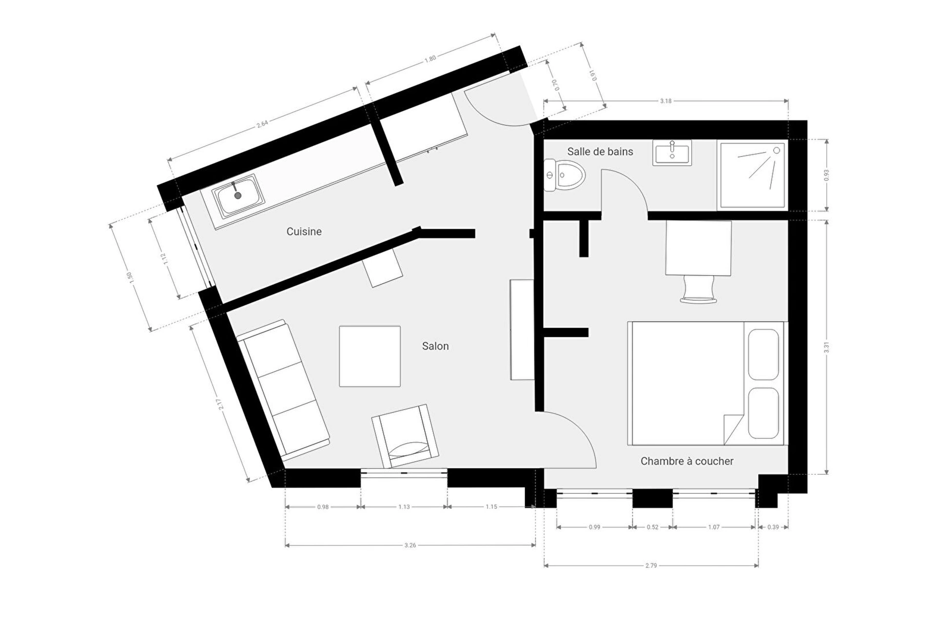 Parfaitement optimisé, il se compose d'une entrée avec rangements, menant à une cuisine et à un séjour. On retrouve enfin une chambre avec espace dressing une une salle d'eau avec WC.
