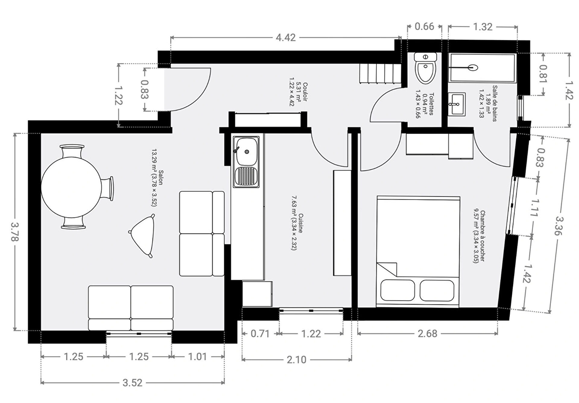 Il se compose d'une entrée, d'un séjour avec parquet d'origine, d'une cuisine semi-ouverte, d'une chambre, d'une salle d'eau ainsi que de WC indépendants.